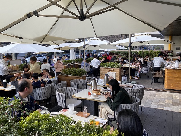 “现在包房和大厅都满了,要等45分钟才有位子。”在杏花楼黄河路店的三楼,店员不停地向消费者发出号码牌,再递出菜单让大家先看起来。“从上午10点多开始,喝早茶的市民就陆续来了,可能是因为周末加上天气好,所以这两天人气特别旺。”下午两点的新天地商圈,也是人头攒动的场景。“前面还有五桌,您可以稍等一下。”在蔡澜港式点心新天地店,不仅店内坐满了人,门口的外摆位也全部客满。阳光正好,新天地时尚Ⅱ的沿街咖啡馆是休憩观景的好地方,记者一路走来,只见街边位置几乎全部坐满,人们排着队从咖啡店里端出冰饮。