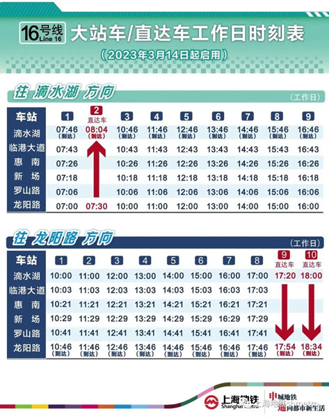 16号线运行方案调整后将进一步提升工作日晚高峰时段,临港地区与市区之间的通勤效率,提请乘客留意新版工作日大站车/直达车发车时刻表,乘坐正确的班次。