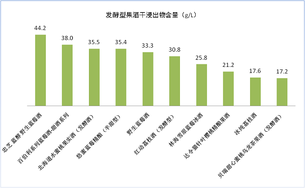 果酒中到底有多少水果成分是消费者普遍关心的问题。“干浸出物”是衡量发酵型果酒果汁含量高低的重要指标,通常干浸出物含量越高,果汁含量越高。试验发现,10款发酵型果酒的干浸出物含量在17.2-44.2g/L之间,整体含量较高。其中大于40g/L的有1款;30-40g/L的有5款;20-30g/L的有2款;10-20g/L的有2款,均符合QB/T5476-2020《果酒通用技术要求》中“干浸出物含量≥10g/L”的要求。此外,10款发酵型果酒均有“原果汁含量”宣称,宣称值为75%-100%,与实测干浸出物含量高低基本相符。配制型果酒中的糖类等多种添加物质会影响干浸出物含量,其所含实际水果成分较难查验。
