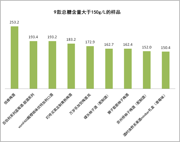 测试发现,35款样品中有24款添加了各种糖类(如白砂糖、冰糖、果葡糖浆等),样品的糖含量总体偏高,其中大于150g/L的有9款,最高为253.2g/L;100-150g/L的有10款;50-100g/L的有12款;小于50g/L的有4款。配制型果酒平均总糖含量远高于发酵型果酒,均值分别为128.2g/L和90.1g/L。
