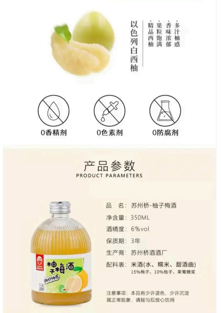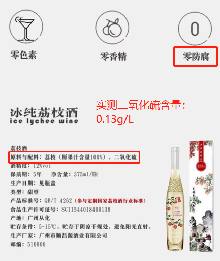 试验中,有2款样品页面上宣称“0防腐”,而实测检出二氧化硫防腐剂,涉嫌虚假宣传。其中一款是由广州市顺昌源酒业有限公司生产的冰纯荔枝酒(标称商标:顺昌源;标称规格:375ml/瓶),配料表中标示含有二氧化硫,与其页面“0防腐剂”的宣称相矛盾。另一款是由中翔鼎立(北京)商贸有限公司销售,标称由苏州桥酒酒厂生产的苏州桥柚子梅酒(标称商标:苏州桥;标称规格:350ml/瓶)。