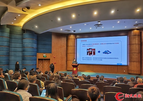 图说:图为《ISO/TS7352:2023集装箱NFC/二维码箱封》负责人包起帆作报告 新民晚报记者 陶磊/摄(下同)