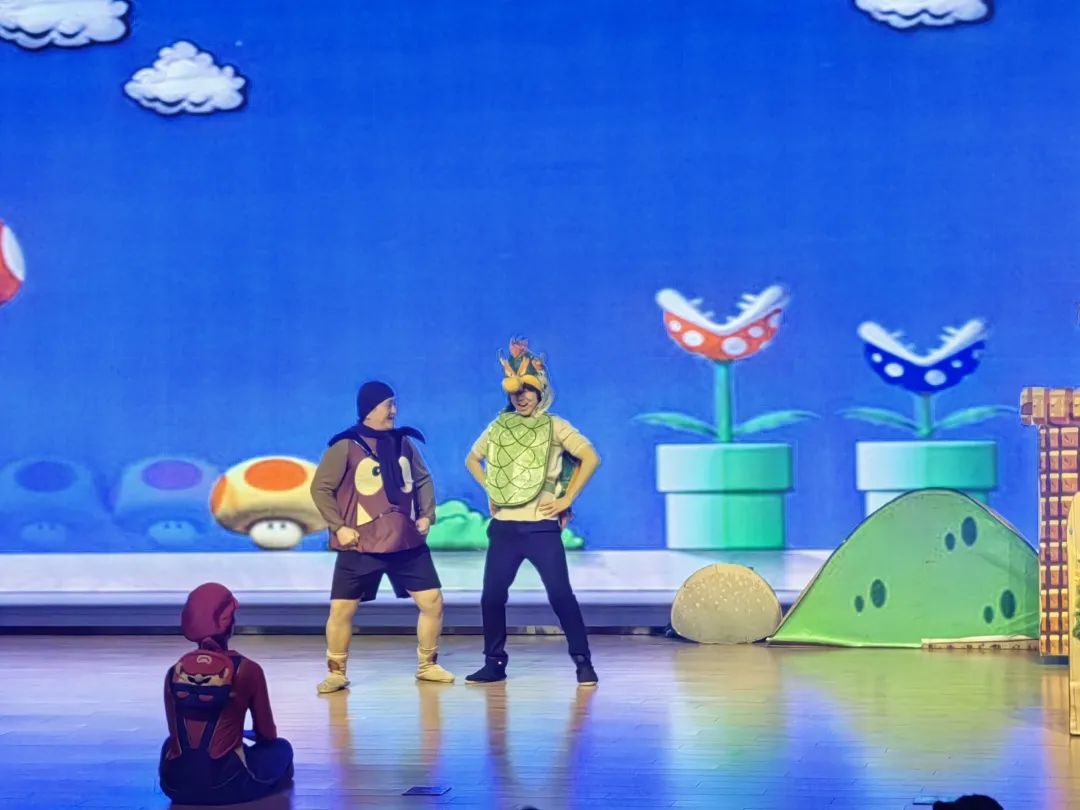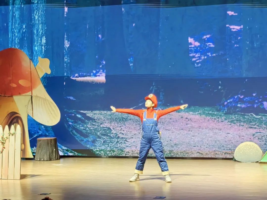 3月25日晚上六点,记者来到位于盈浦街道社区文化活动中心的追梦剧场,看到现场座无虚席:台下的小朋友们早已落座期待台上的演出;舞台上,由背景荧幕与前台道具共同搭建起了一个美丽、充满童趣的“蘑菇王国”;演员们正在用语言与动作生动地表演着一出勇士拯救公主的精彩故事;伴随着剧情深入,小朋友们时而捧腹大笑、时而被玛丽感动。随着公主被玛丽从恶魔手上救出,故事也来到了最高潮,小朋友们情不自禁地鼓起了掌。