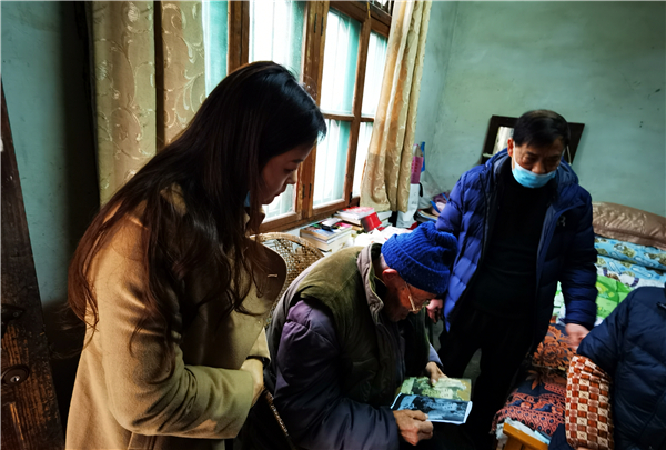 图说:志愿者拿着画像,找到郑梦生核对画像与蔡财根本人的差别。松江烈士陵园供图