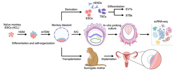 研究团队创新性地用食蟹猴的胚胎干细胞。这种细胞可无限增殖,具有分化为各种组织类型细胞的潜力。经过培养条件的优化,研究人员利用生长因子诱导这些胚胎干细胞形成了类囊胚。