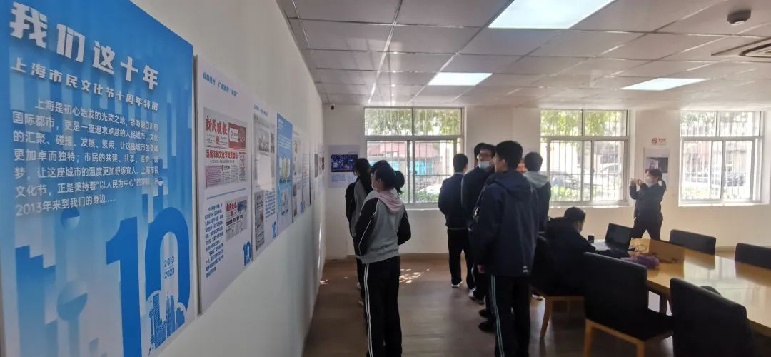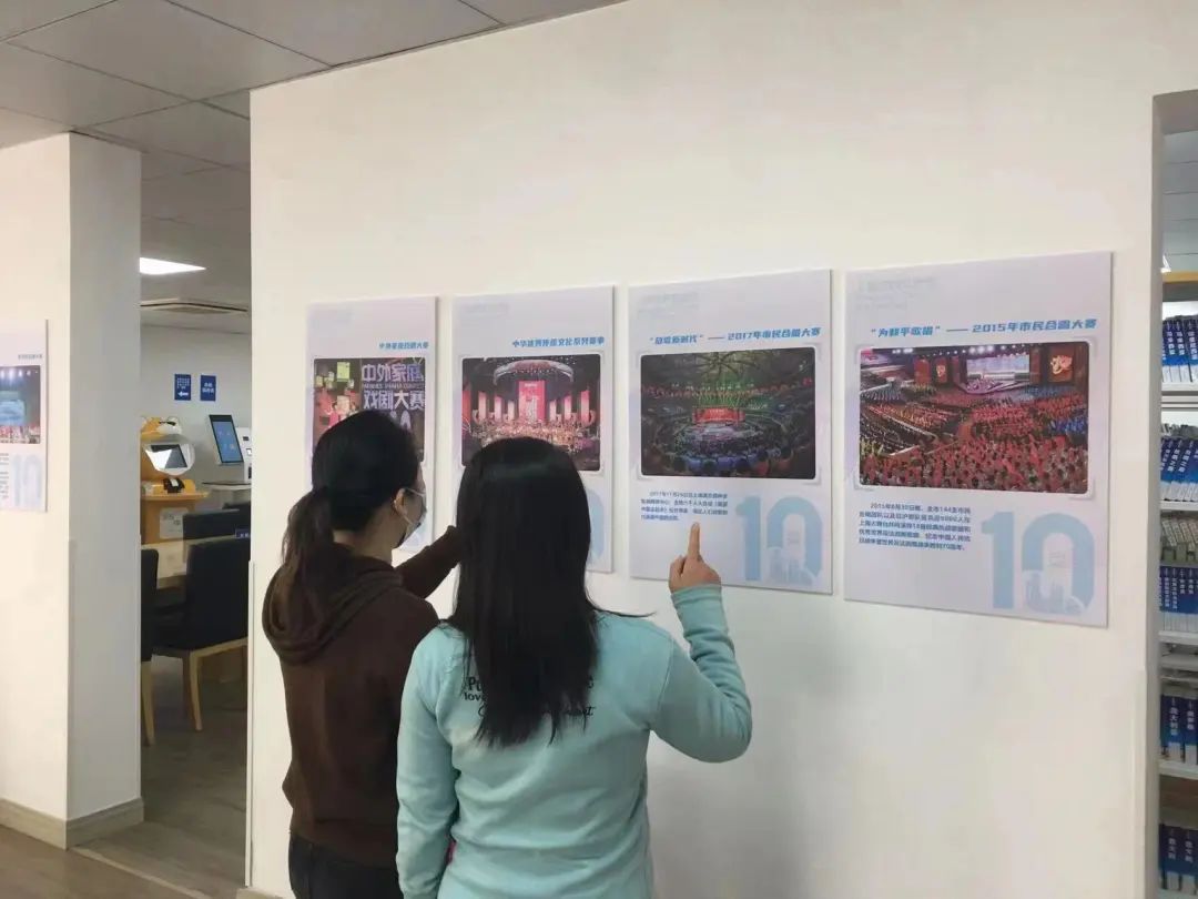 “2013年首届市民文化节发英雄帖”“2016年举办‘回家吃饭’市民烹饪大赛”“2018年举办‘最美公共文化空间’大赛”“2019年举办青少年传统文化知识大赛”........一块块图文并茂的展板贴在图书馆的墙面上,生动地展示了上海市民文化节十年来走过的历程,并重点呈现了各个重要事件和活动的精彩瞬间。