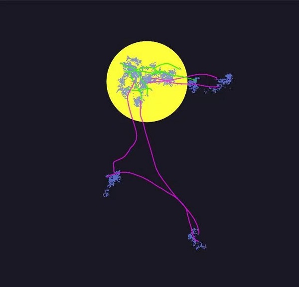 图说:中秋时节,当人们注视满月,眼睛不是静止不动的(图中蓝点为注视点轨迹),而是伴随着不易察觉的微跳视(图中绿色线条)和大跳视(图中紫色线条),时刻改变着眼睛的注视位置。微跳视的幅度较小,它可以避免视网膜适应,保证眼睛能够一直感知到月亮,大跳视则会将注视点从月亮转移至其他位置从而破坏注视活动 来源/采访对象供图