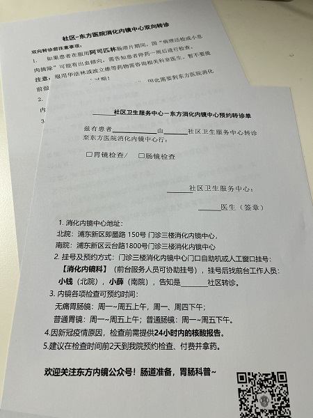2019年,东方医院副院长徐美东牵头并联合浦东新区多个社区,成立“东方大肠癌早筛区域联盟”搭建大肠癌早筛双向转诊平台。家住东明社区的王阿伯感叹:“感觉真的太方便了,在社区筛查中发现我是大肠癌高危人群,后来社区医院帮我把东方医院的内镜检查时间很快约好了,最贴心的是,检查注意事项都一个不落地帮我列了出来。”