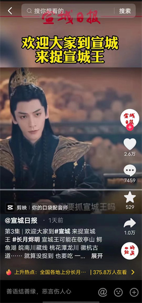 剧中的宣城王萧凛也让安徽宣城找到了宣传点,“宣城来抢长月烬明了”等话题登上热搜,“相看两不厌,唯有敬亭山”的敬亭山坐落在宣城为更多观众所知晓,成为当地讲好宣城故事的一次创新探索实践。在《长月烬明》的热度带动下,不少观众跟着剧集脚步向春而行。剧中般若浮生支线开启之后,战神冥夜和蚌族小公主桑酒间的虐恋故事引发观众热议,蚌埠这座城市也因为意外的“谐音梗”成为剧集受益者。