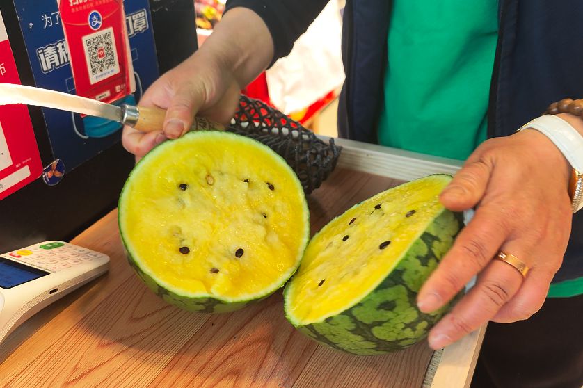 只见摊主随手拿起一个冰淇淋西瓜,用水果刀在西瓜的表皮上轻轻一划,瓜皮瞬间裂开,露出嫩黄色的果肉,充盈的汁水也顺着裂口流淌下来。店主表示,这个品种的西瓜皮薄肉多、甘甜多汁、像冰淇淋一样入口即化。