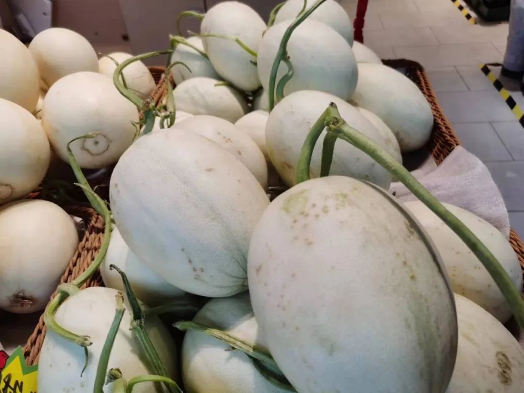 与此时同,上海地产甜瓜也受到了市民的青睐。奶白色的表皮,长着细细绒毛,还连着绿色瓜秧的南汇玉菇,在水果摊位上散发着阵阵香气,吸引了不少市民驻足挑选。