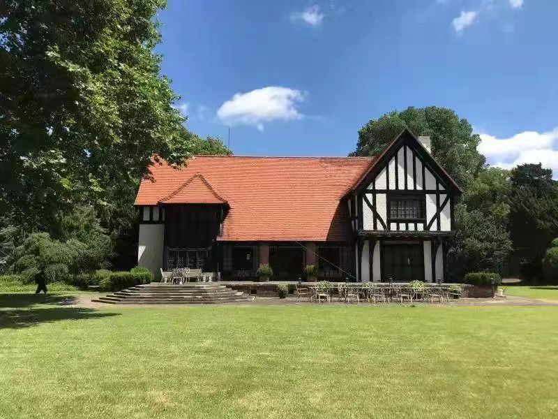 沙逊是最早到上海的外国冒险家之一,被当时的人们称为上海地产大王,因一战期间左脚伤残,人称“翘脚沙逊”。位于虹桥路2310号的这座花园别墅是沙逊在虹桥路上的两处别墅之一,由于靠近罗别根路(今哈密路),故又称罗别根花园(Rubicon Garden),1930年由大中实业公司建造,公和洋行设计,1932年建成。这幢经典的英国乡村别墅占地面积4860平方米,二层砖木混合结构,建筑面积960平方米,坐北朝南,黑色机制平瓦陡坡屋面,墙面木构架外露油黑色,外墙面粉白色,底层外墙红砖清水勾缝,长方形钢窗多落地式,有大小房间12间,南侧花园绿树成荫,颇有自然情趣。