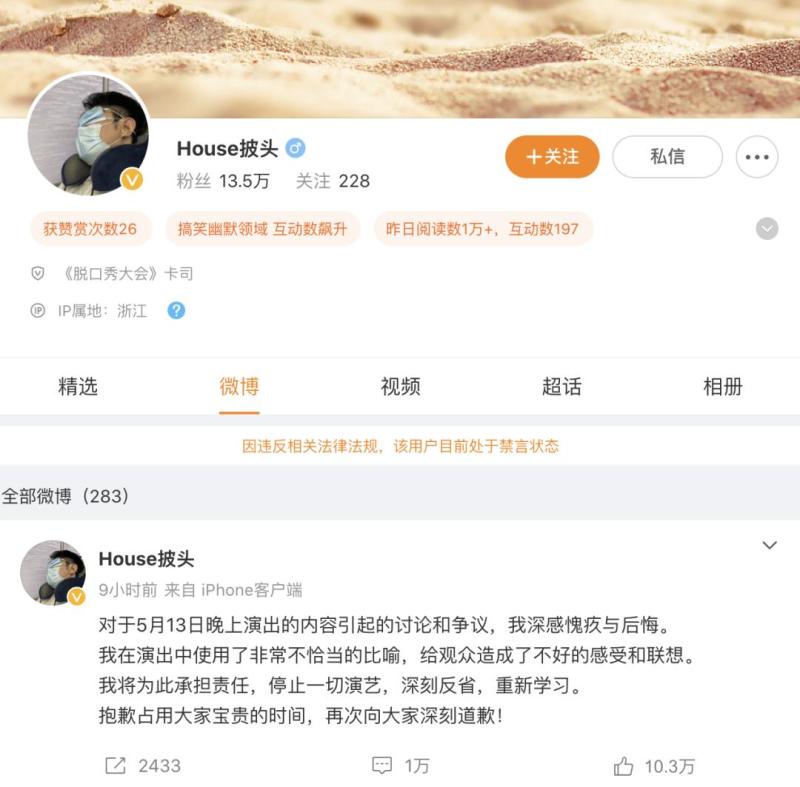 5月15日23时许,记者注意到,表演中出现不当言论的脱口秀演员House(李昊石),个人微博被禁言。