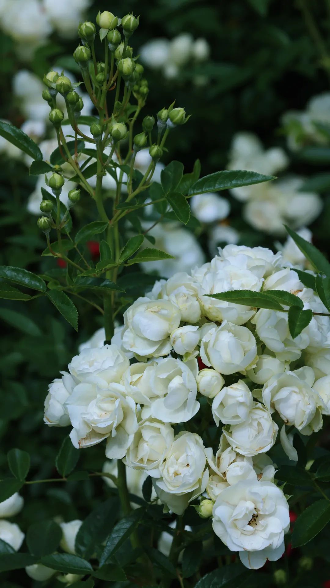 灌木月季直立性好,按照枝条高度分为两类,0.5米以下的被称为矮灌月季,0.5-2米的被称为灌丛月季。灌木月季是从顶端开花的,花型华丽、花量大,不仅有不同颜色的单色花朵,而且还有复色的花朵。