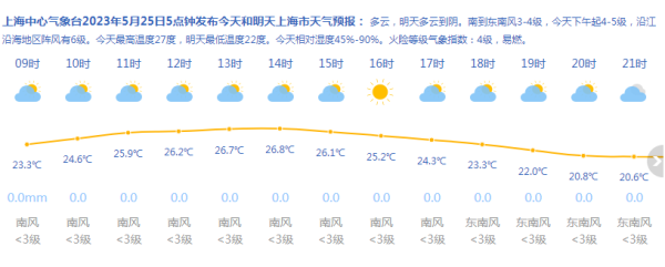 上海中心气象台2023年5月25日5点钟发布今天和明天上海市天气预报:多云,明天多云到阴。南到东南风3—4级,今天下午起4—5级,沿江沿海地区阵风有6级。今天最高温度27度,明天最低温度22度。