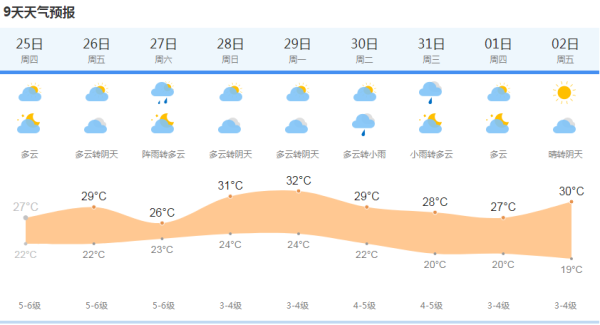 上海今天多云,最高温度仅会升至27度,春末的天气不冷不热,中午有时间不妨在办公楼周边散散步,明后天申城的最高温度也依然在30度以下,要到周日才会重现高温天。今天沿江沿海地区会有6级阵风,过江时仍须适当控制车速。