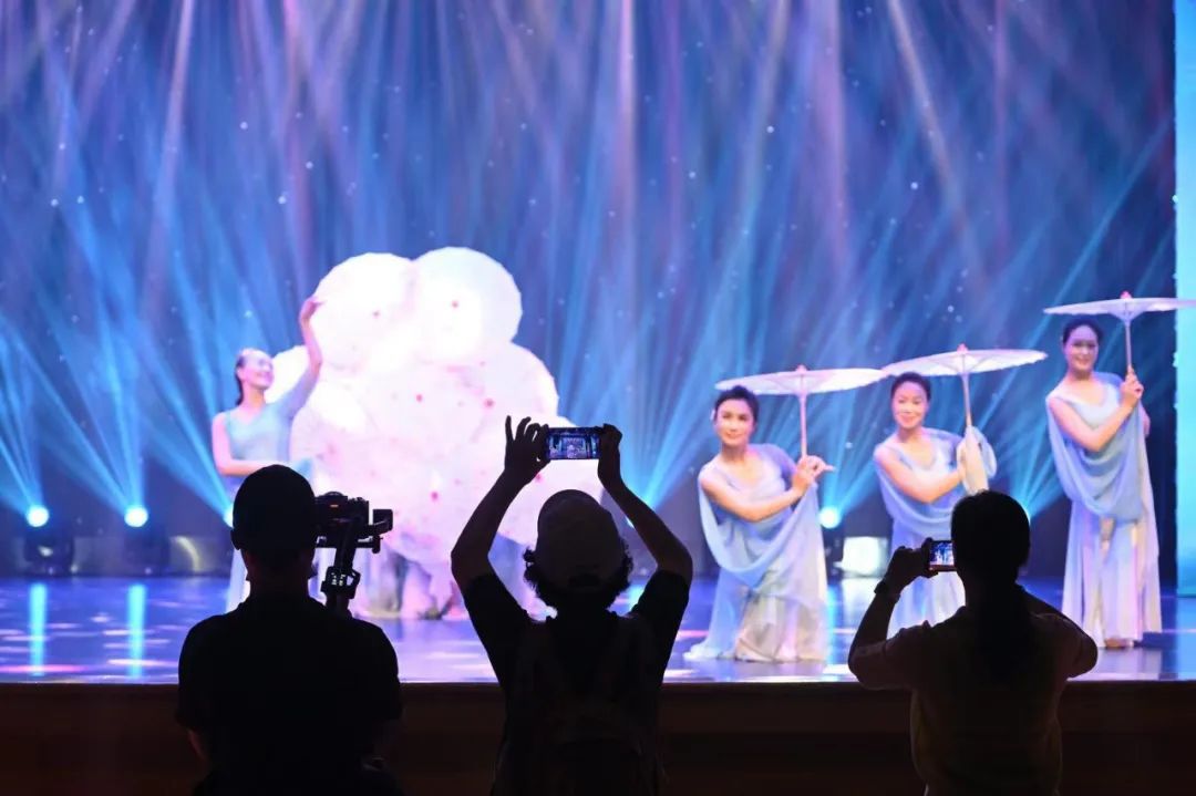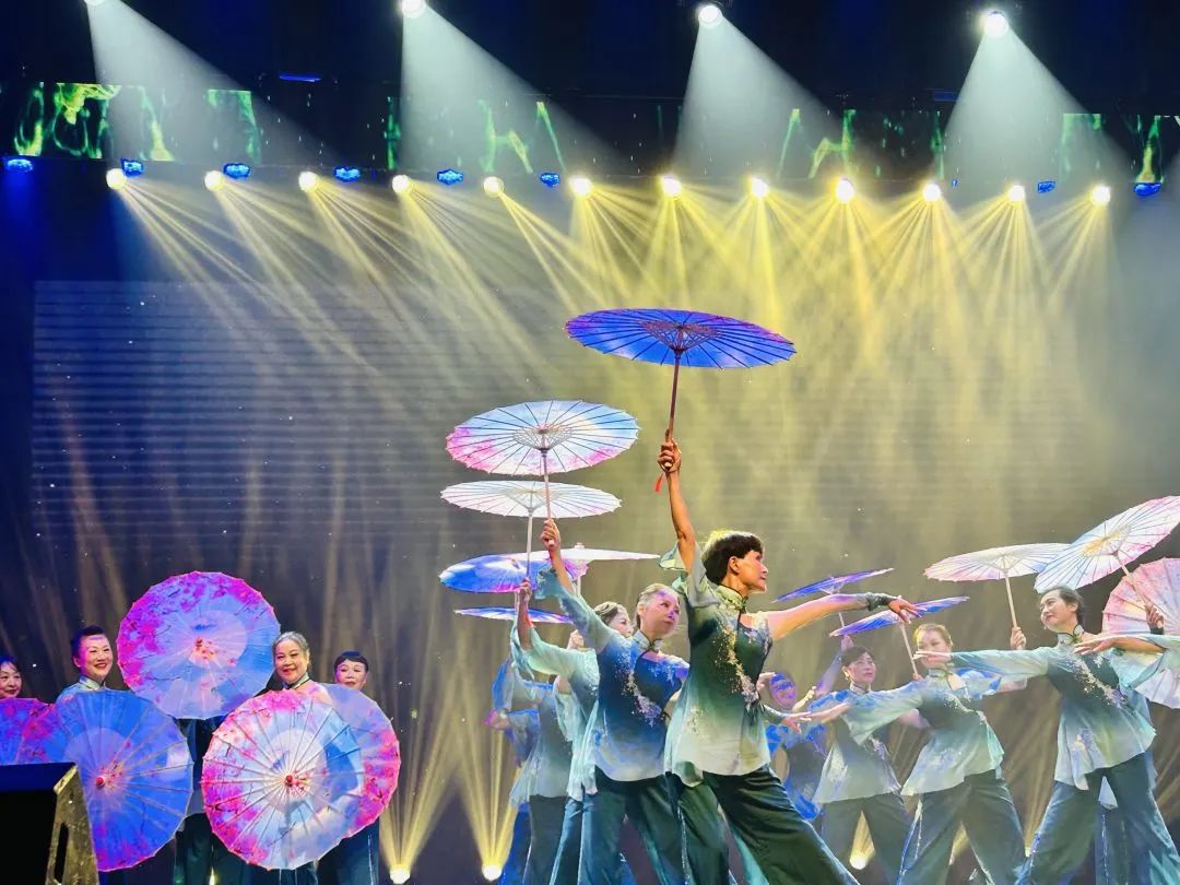 田林街道排舞队的姐姐们以女性特有的柔美,呈现对中华传统文化的诗意表达。在作品《桃花雨》中,她们清颜白衫,青丝墨染,时而抬腕低眉,时而轻舒云手,乐声婉转于耳畔,手中纸伞如妙笔、如丝弦,转、甩、开、合、拧,行云流水,龙飞凤舞。