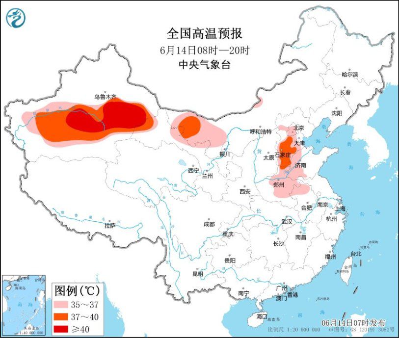 昨天,新疆中南部、内蒙古西部、广东中部等地出现35℃以上高温天气,新疆吐鲁番局地40~42.9℃。未来三天,华北东部、黄淮及新疆、甘肃西部、内蒙古西部等地部分地区有35~39℃的高温天气,新疆吐鲁番等地最高气温将超过40℃。气象专家提醒,北方地区暑气大涨,天气炎热,老人、小孩或体质较弱人群应尽量避免午后高温时段外出,同时注意避暑防晒,做好补水降温的工作。