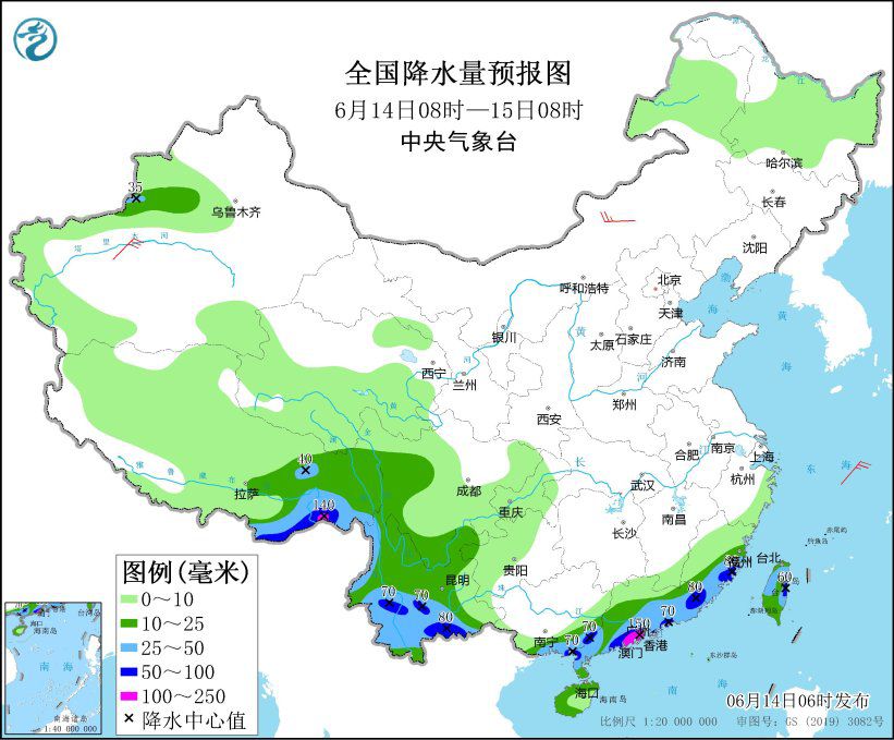 中新网6月14日电 据中央气象台网站消息,中央气象台预报,未来三天,我国整体的天气形势为北晴南雨,北方大部地区将陆续感受到炎炎夏日的威力,西安、郑州、石家庄今明两天最高气温将在37-39℃;南方降雨主要集中在华南沿海地区,雨量普遍有大到暴雨。华南这种临近端午节的大范围强降雨又称为龙舟水。气象专家提醒,未来三天进入华南“龙舟水”集中期,需注意持续性强降雨可能引发的次生地质灾害。