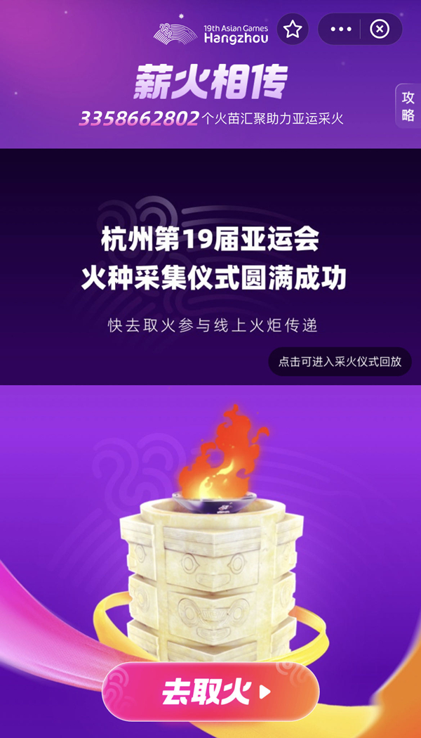 杭州亚运会火种成功采集后,由现场的护送者依次引入火种盒及火种灯,同时,杭州亚运会线上火炬传递正式开启,接下来的三个月里,全球网友可通过“智能亚运一站通”平台成为亚运火炬手,以特别的方式参与火炬传递,助力亚运盛会。