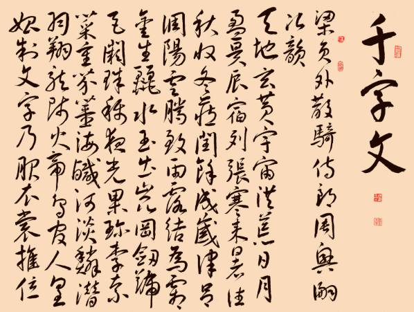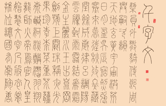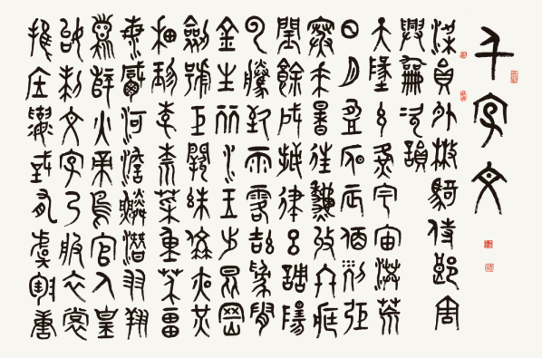 田金生在临近古稀之年变法,循着中国书法发展的脉络,从3000多年前的高古书体写起,重新演绎名篇《千字文》。他选择大篆起步,进而是秦朝统一后的小篆,然后是唐代的铁线篆。脱胎于篆书的隶书无疑是书法史上一座伟大的里程碑,由隶书伸发的一脉如大楷、小楷、行楷和行草,另一脉如章草、小草和大草,田金生也都一丝不苟地呈现。一篇《千字文》是这11种书体来表现,11000个字,每字都不尽相同,尽显中国书法的博大、悠远和精深。完成一个“千姿百态”展,就如同循着中国书法几千年的发展溯游而下。