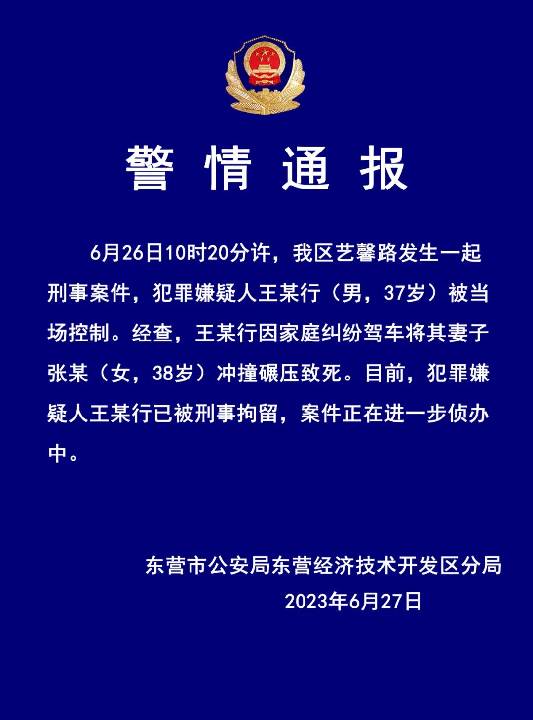 东营市公安局东营经济开发区分局27日晚发布警情通报称,6月26日,东营开发区一男子因家庭纠纷驾车将其妻子冲撞碾压致死。目前,犯罪嫌疑人已被刑事拘留。
