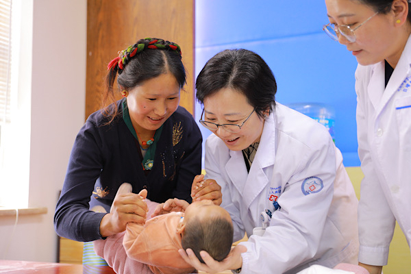 在日喀则人民医院现场,附属上海儿童医学中心发育行为儿科主任医师江帆为患儿进行身体检查,还对家长进行儿童健康保健教育,示范教授如何给孩子做抚触、引导孩子抬头等,为改善患儿病情进行科学性的指导。附属上海儿童医学中心营养科主任医师洪莉就现场患儿情况与视频那头的附属儿童中心医疗专家进行深入交流探讨,制定进一步治疗措施和方案。
