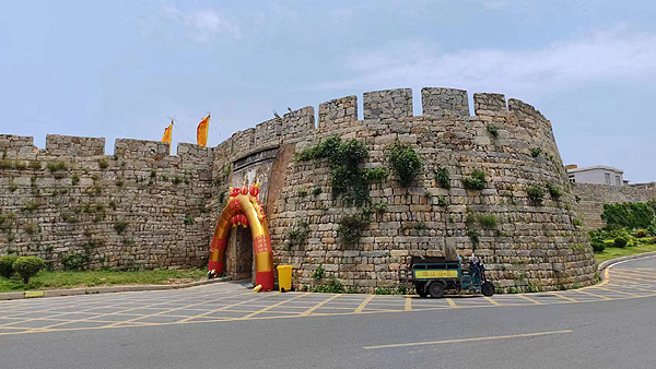崇武古城处于东海与南海的分界处,为“中国东海南海气象分界线”,其标志塔碑稳稳地矗立在古城东南角。崇武古城堡是我国东南沿海仅存又保护完好的一座。古城堡北门上雕刻着“锁震海邦”四个朱红大字,传为民族英雄戚继光所书。拾级登上城墙,踏着斑驳发亮的青石板古道,眺望城墙外的碧海波涛,俯视城内层层叠叠石砌的楼宇庙堂,胸中豪情顿生。数百年来,古城民众凭借着坚固的石城,在抗击倭寇与外患的战斗中立下不朽功勋;如今,古城堡成为后人景仰的文化纪念地。