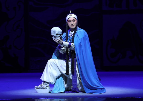 在文武并重的《王子复仇记》中,观众可以看到傅希如饰演的子丹在京白、韵白间自如切换,“见父”一折不仅考验唱功,他的表演更结合了人物复杂情绪,趟马、甩发、朝天蹬、掏翎子等大量技巧展示一气呵成。四个屏风既是前殿壁墙,又是后宫帷幔,屏风上由篆、隶、魏、楷等各种字体书写着《哈姆雷特》的经典台词——“生存还是毁灭,这是值得思考的问题”,进一步烘托了悲剧宿命感。而传统的高背椅时而成了城墙,时而成了墓碑,展现出京剧的虚拟性和高级美。
