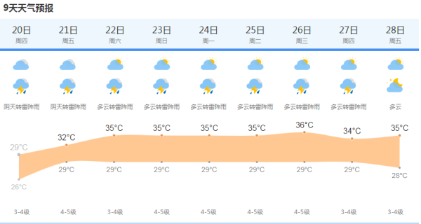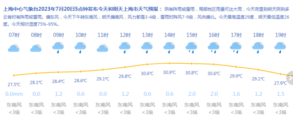 上海中心气象台2023年7月20日5点钟发布今天和明天上海市天气预报:阴有阵雨或雷雨,局部地区雨量可达大雨,今天夜里到明天阴到多云有时有阵雨或雷雨。偏东风,今天下午转东南风,明天偏南风,风力都是3—4级,雷雨时阵风7—9级,风向偏北。今天最高温度29度,明天最低温度26度。