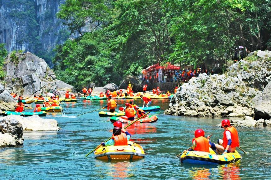 漂流的一开始,你将会进入七彩隧洞,在幽暗的隧道里穿峰绕岩,为漂流增添了一份神秘刺激。从隧道出来之后,将沿着河道继续漂流,途中环境优美、风光旖旎,满目皆是绿色。
