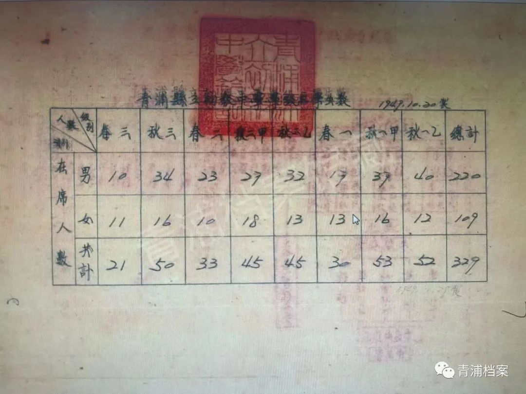 青浦县立初级中学学级与学生数(1949年10月)
