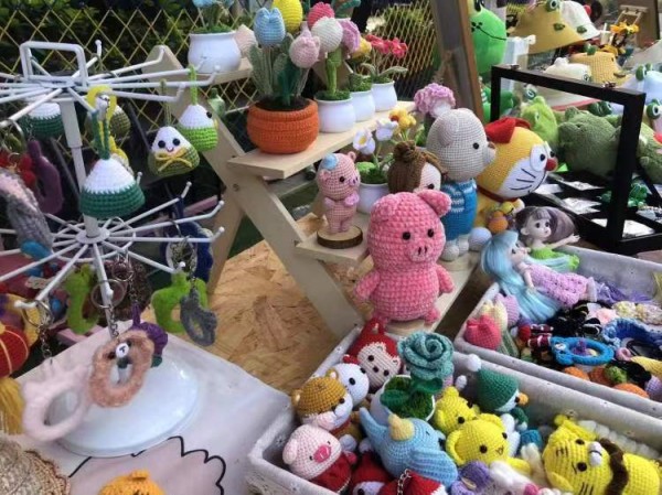 花甲之年的严阿姨摊位前,不少女生驻足挑选发夹、玩偶、花束、帽子、拎包……而摊位后的严阿姨则戴着眼镜用钩针灵巧地钩着物件,原来这些全都是她亲手用毛线、丝带等钩出来的。