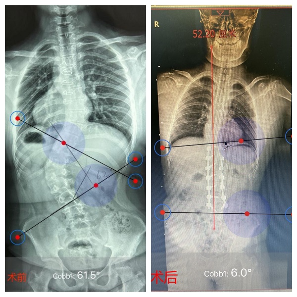 图说:患者术前62°的脊柱侧弯,术后仅为6°
