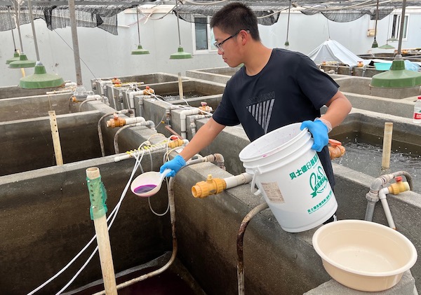 8月10日一大早,上海海洋大学水产与生命学院2021级渔业发展专业研究生周虎鹏就来到上海金山虾类科技小院。他换上厚厚的水裤,为南美白对虾苗投喂饲料。