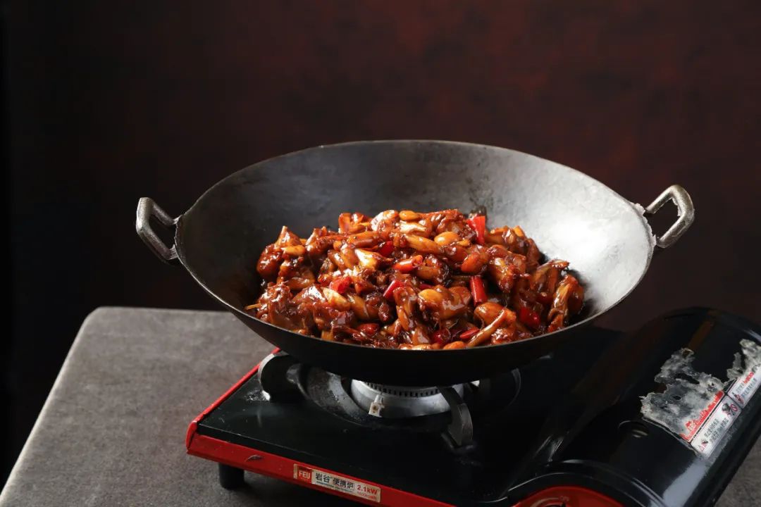 玛拐锅几乎是每桌必点的菜品,它的食材选择就颇为讲究。餐厅的刘厨师长介绍道:“‘玛拐’是广西的方言,实际上指的是稻香蛙,个头比牛蛙小一点,每一只都是要经过挑选,选择个头中等的,不要太大的,再配上我们秘制的酱料、腌制的酸浆和泡椒。”