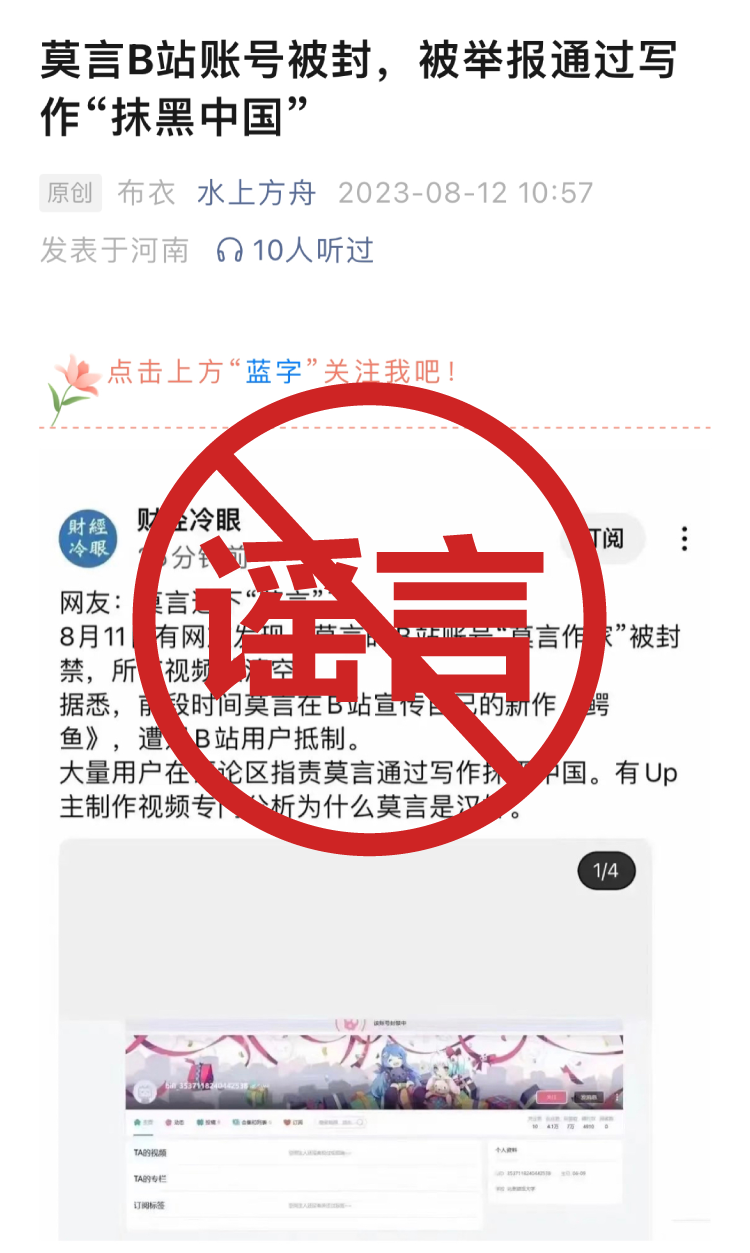 近期,我们关注到有网络账号杜撰称“莫言B站账号被封”等文章。经核实,此前有用户冒名注册“莫言作家”账号,并搬运莫言本人在其他社交平台上发布的内容。B站已对该高仿账号进行永封处理并下架全部侵权稿件。我们呼吁广大用户与平台一起共同维护清朗网络空间,坚决反对恶意冒充他人等不当言行。针对网络上蓄意编造、散布“莫言B站账号被封”等谣言的行为,我们将依据《网络信息内容生态治理规定》等规定采取相应法律手段,打击网络谣言,维护用户合法权益。