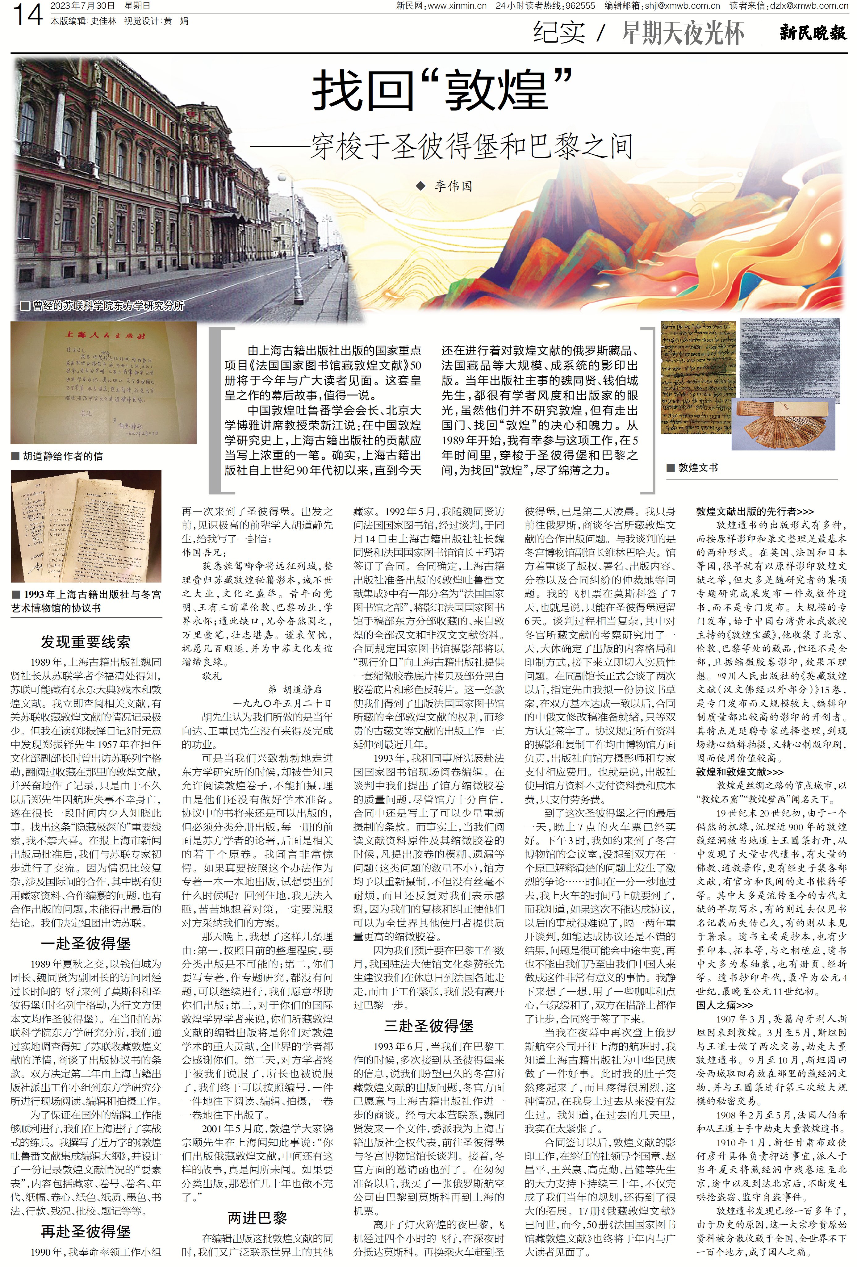 据李伟国回忆,1989年,时任上海古籍出版社社长的魏同贤从前苏联学者李福清处获知,前苏联可能藏有《永乐大典》残本和敦煌文献。正是这个重要提醒,让上海古籍出版社的出版家们联系起《郑振铎日记》中对于1957年出访前苏联列宁格勒(今圣彼得堡)时,翻阅过收藏在那里的敦煌文献的记叙,从而推动了当年组团出访苏联,并最终找回“敦煌”的历程。