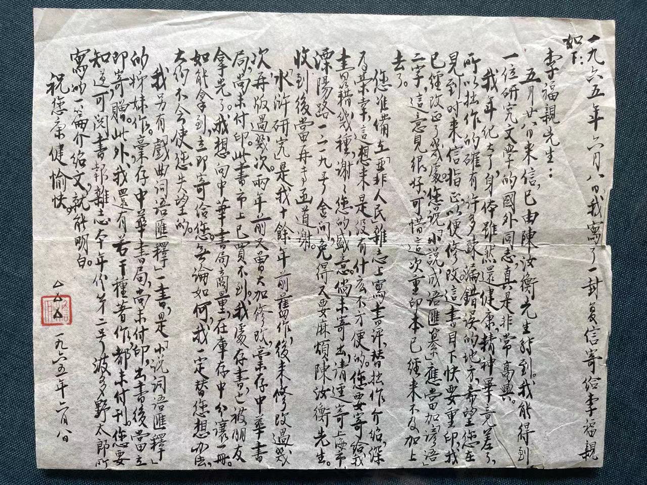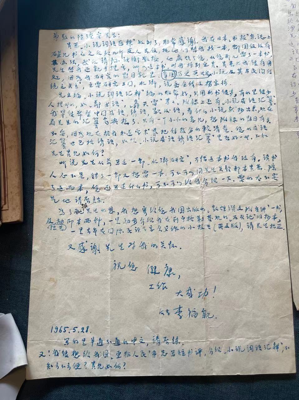 陆澹安对友人所托向来认真,收到陈的消息,以及李福清的亲笔信,他立刻提笔复信,表示除了《小说词语汇释》,自己还有姐妹篇《戏曲词语汇释》。至于李福清在信中另索的《水浒研究》,因是十多年前的旧作,身边已无存书,但陆澹安表示会向中华书局商量,在库存中分让一册,“无论如何,我一定替您想办法,大约不会使您失望的”。对于李福清信中提议《小说成语汇释》应当加“谚语”二字,老先生也表示:“这意见很好,可惜这次重印本已经来不及加上去了。”这封信写于1965年6月8日,两个月后,来到北大进修的李福清回信道,因为没有辨认出陆澹安地址中溧阳路的第一个字:“只有您地址的头一个字我有些怀疑,是溧水的溧字儿?”所以,他不敢将书直接寄给陆澹安,还是寄给了陈汝衡转交。这封长信里,李福清向陆澹安汇报了自己所作的有关中国俗文学研究的一些成果,包括写了《穆天子传在中国文学史的地位》,在《亚非杂志》发表了《补订中国文学书目》等。