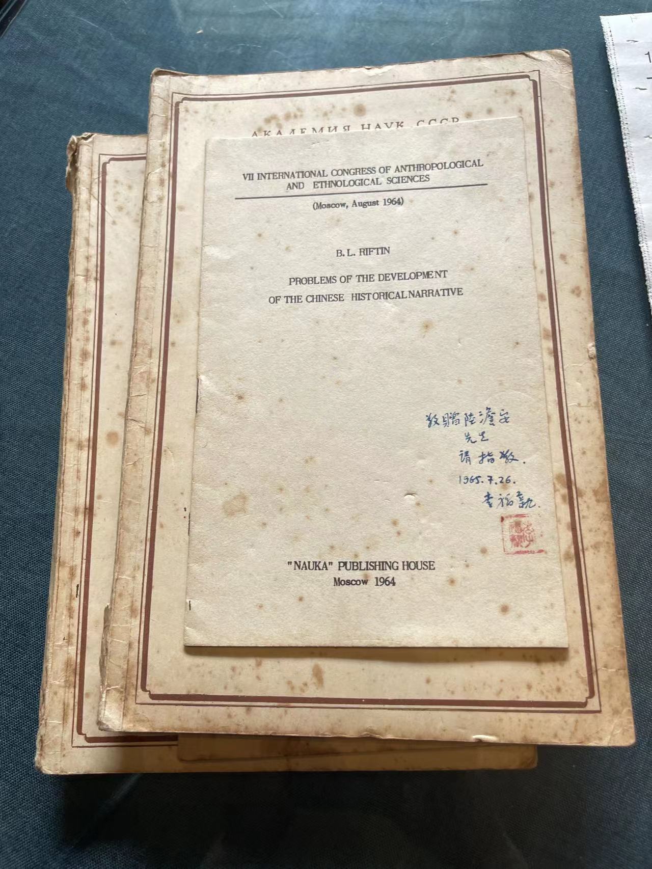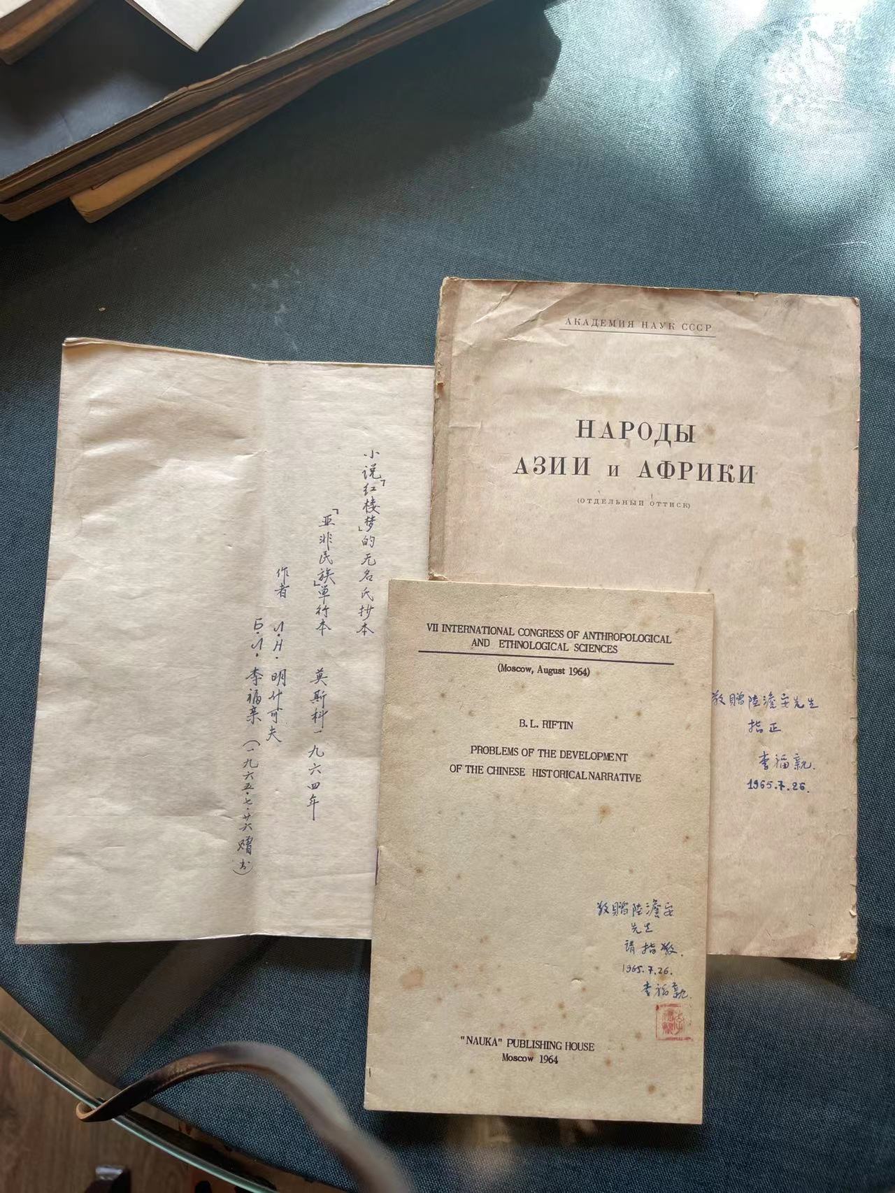 从之前李福清的信中,知他计划将于当年七月回国。要说明的是,在六十年代的信函中,李福清落款署名是李福亲。1963年,莫斯科东方出版社出版了《敦煌赞文附宣讲》,首次影印刊布了苏联所藏十一件敦煌俗文学作品写本。如今,陆澹安的文孙陆康依然保留着所有两人的来往信函,在当年李福清寄来的种种影印件中,就有一册黑色封皮的影印本,正面是中文书名《敦煌赞文附宣讲》,封底是俄文。如今翻来,尤觉珍贵。
