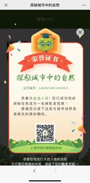 完成口袋公园、古树、绿道三大类点位的拍照上传后,即可获得电子证书,并前往家门口的市民园艺中心领奖(送完即止)。