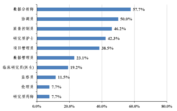 在针对临床研究一线人员的访谈和问卷调查中,调研组发现临床研究员(医生)、数据管理员、项目管理员、质量控制员是医疗机构临床研究中配备最多的岗位类别,此外参与临床科研的还有研究型护士、研究型药师、数据管理员、数据分析师、协调员、监察员、质量控制员、伦理员等。其中,数据分析师、协调员、质量控制员、研究型护士被调查临床研究团队负责人认为是最紧缺人才。