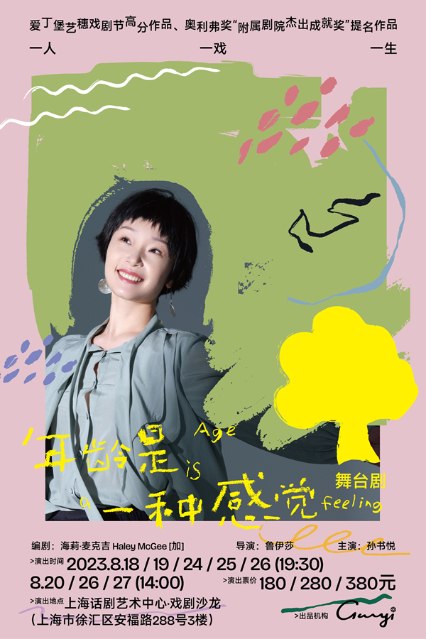 单人舞台剧《年龄是一种感觉》由加拿大编剧海莉·麦克利创作。全剧唯一的主演作为一名神秘的叙述人,展现了一位女性从25岁开始到生命终结为止经历的亲情、爱情、友情,由收件箱、书、卵子、牙齿、飞机、狗狗、餐厅、野苹果树12个独立又相关联的故事组成。不同的是,每一场演出都有三轮抽卡片环节,由现场观众抽卡决定将由哪6个故事被表现在舞台上,正如剧中主角所说一样:“没有人了解你一生中将会发生的一切,即使是你自己。”