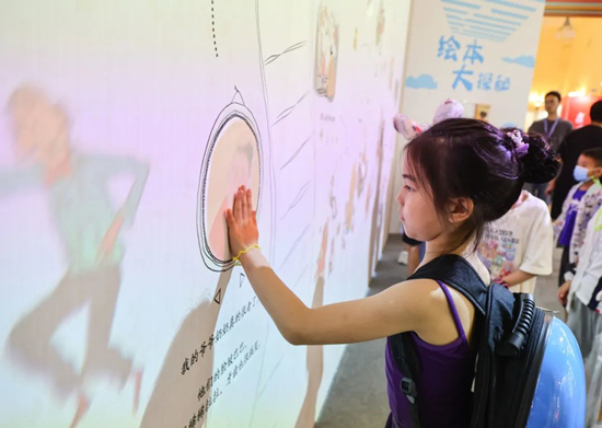 除了可以看直播外,今年的童书屋现场推出“遇见AI一起绘画”互动项目,读者可以通过与AI进行语音通话的方式,传达自己想要生成的插画内容和风格,几分钟后,AI智能机器人就会生成一幅独特的插画作品。这也是书展上小朋友最喜欢的互动项目之一。