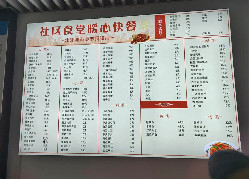 这家社区食堂很受周边老年人和白领欢迎。午间高峰时段,就餐区常常座无虚席。光看菜单就很吸引人呢~