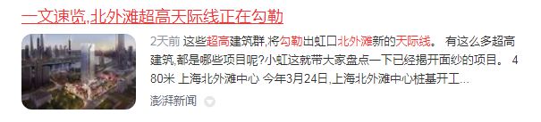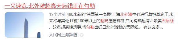 上周,上海虹口微信公众号发布《一文速览,北外滩超高天际线正在勾勒》,央媒、市媒以及腾讯、网易、搜狐、新浪等平台广泛关注。