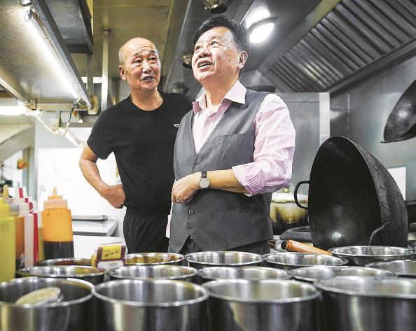 图说:黄才根(右)和老同事回到工作多年的春光饭店,感慨良多