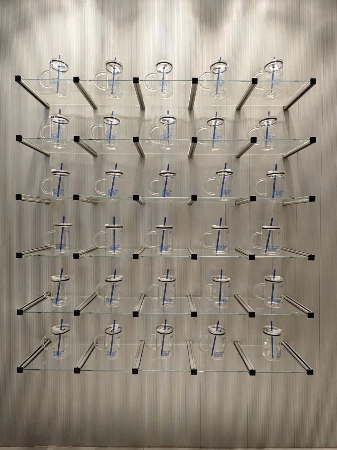 (m)3新店位于古北SOHO负一层,空间设计以高级灰为主色调,墙面上印着蓝色的品牌logo,蓝与灰相互映衬,给人一种简约又高级的氛围感。而咖啡周边在颜色上主要以蓝色为主色调,辅以黑白配色,三种颜色相互碰撞,同样营造了高级、潮流感。