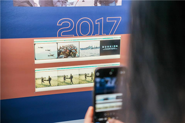 2014年,诺兰带来了电影《星际穿越》,使用IMAX 胶片摄影机拍摄的场景时长到了75分钟,也是从这部影片开始,诺兰开始使用IMAX 胶片相机拍摄更多奇观镜头,比如虫洞、滔天巨浪、五维空间等等。在2017年,诺兰使用IMAX 胶片摄影机拍摄了电影《敦刻尔克》70%的镜头,剧组把体型庞大的IMAX 胶片摄影机架设在飞机上,以空中实拍的方式捕捉战斗机的飞行状态。在2020年的影片《信条》中,诺兰更是运用IMAX 胶片摄影机实拍了影片中的逆向视觉奇观。为此,摄影团队重建了胶卷盒中的机械部件,使得摄影机能够正向逆向同时拍摄。(《蝙蝠侠:侠影之谜》《致命魔术》《盗梦空间》《信条》未有胶片展出)