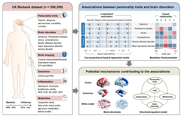 研究团队基于英国生物样本库队列随访了298259名人群,在平均随访9.49年的过程中,32035位参与者被诊断为新发痴呆、帕金森病、卒中、精神分裂症、双相情感障碍、抑郁症或焦虑症。该团队提取了这些参与者的问卷调查数据,构建了五大类人格特征,包括宜人性(热情)、尽责性(勤勉)、神经质(紧张)、外倾性(社交)和开放性(好奇),探讨了这些人格特征与常见脑疾病之间的关联及潜在机制。